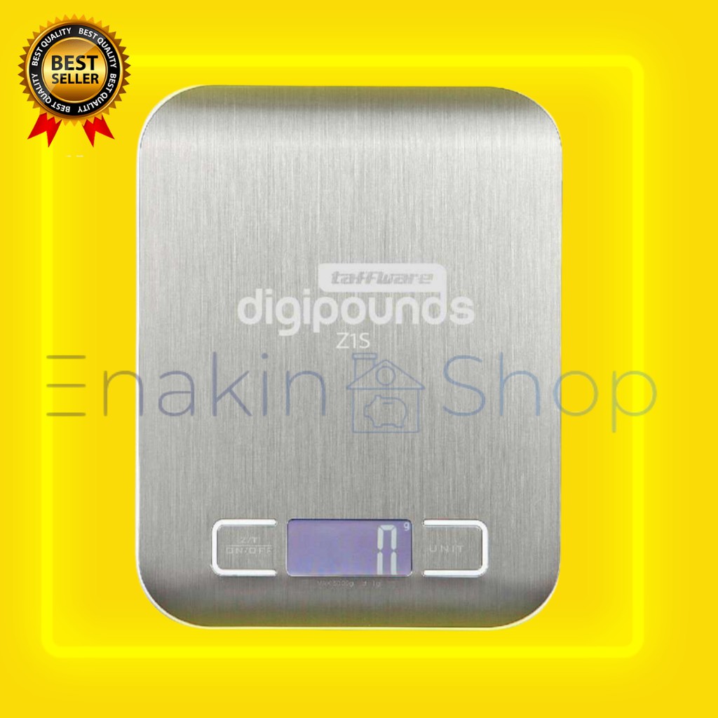 Timbangan elektronik yang dapat memuat berat hingga 5kg dengan keakuratan 1g. timbangan beralasan lempengan besi ini sangat kokoh dah kuat. Timbangan ini dapat digunakan untuk menimbang berat emas, koin, dll.Note: Terdapat logo TAFFWARE pada fisik produk.Features Blue LCD Display Timbangan digital ini memiliki layar LCD berwarna biru sebagai penunjuk angka sehingga tetap dapat digunakan ditempat yang kurang cahaya. 5kg Load Timbangan mini ini dapat mengukur hingga berat 5kg dengan tingkat keakuratan 1g. Easy To Use Desain yang kecil dan mudah untuk dibawa kemana saja. Package ContentsBarang-barang yang Anda dapat dalam kotak produk: 1 x Scale 2 x AAA BatteryVideo YouTube dibawah hanyalah ilustrasi fungsi dan penggunaan produk. Kami tidak menjamin barang kami 100% mirip dengan produk dalam video YouTube tersebut.Keunggulan Produk : - bahan material stainless , anti karat, lebih tahan lama- Desain lebih modern, penggunaan simple dan nyaman- Tahan air dan mudah dibersihkan- Hasil timbang lebih akurat- Bisa mengukur untuk berbagai bahan makanan seperti tepung, teh, ramuan obat, dll- Range berat antara 1 gram sampai 5 kg- Tampilan layar LED , lebih jelas dan akurat- Terdapat fitur reset dan satuan dapat disetting sesuai kebutuhanSpesifikasi Taffware Digipounds Timbangan Dapur Digital Kitchen Scale 5kg 1g - Z1SSatuan Ukur : lb:oz, g, oztRentang Pengukuran : 11 LB / 5000gLama Pengukuran : 1g / 0.05ozDaya / Power : 2 x AAAMaterial : Stainless SteelDimensi : 18 x 13.9 x 1