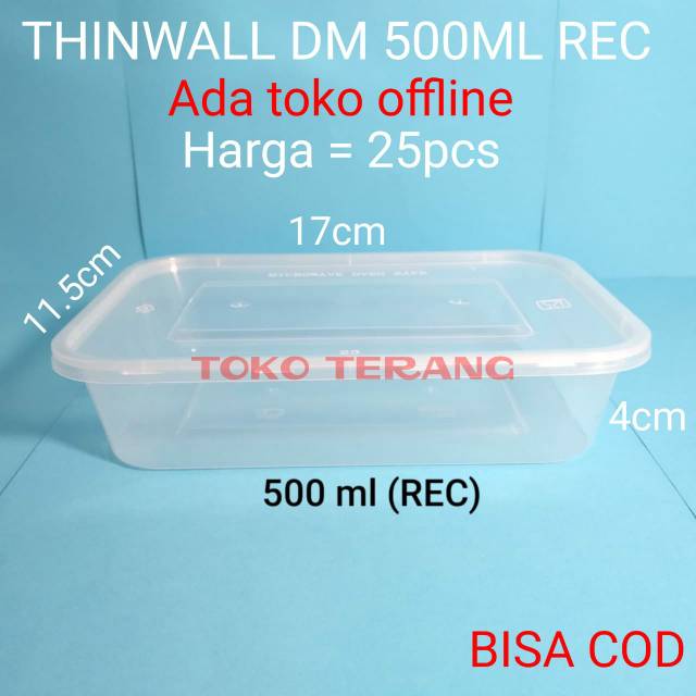 Thinwall DM 500ml (REC)▪︎Food grade▪︎Tutup rapat▪︎Bisa dikukus▪︎Bisa freezer▪︎Bisa microwave▪︎Tahan sampai 100°C《 Harga dapat 25pcs 》Tambahkan packing kardus untuk meminimalkan kerusakan pada saat di ekspedisi, "packing kardus" bisa dicari di etalase.Ketentuan toko* Barang yang sudah dibeli tidak dapat ditukar atau dikembalikan dengan alasan apapun.* Kerusakan yang disebabkan oleh ekspedisi bukan tanggung jawab kami.* Sebelum dikirim barang sudah dihitung dan dipacking dalam keadaan tidak pecah.* Tambahan kardus bukan jaminan barang anda akan sampai dalam keadaan 100% tidak akan pecah, tetapi melakukan tindakan pencegahan pecah t