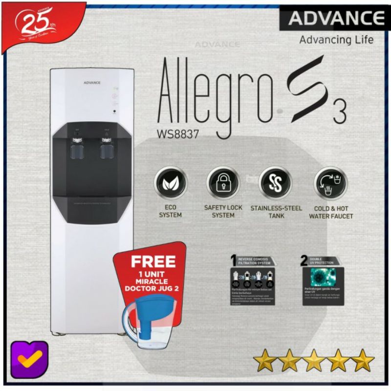 Allegro S3 adalah alat pemurni air dengan sistem Reverse Osmosis yang mampu menghasilkan air minum yang aman dan menyehatkan. Dilengkapi dengan kombinasi Triple Hygiene Protection dan AI Powered System. TRIPLE HYGIENE PROTECTION sistem perlindungan air minum dari kontaminasi Zat kimia berbahaya logam berat terlebih dari virus yang ada di dalam air secara menyeluruh. AI POWERED SYSTEM teknologi AI yang mengatur sistem ECO Sensor dan UV Star Mode secara otomatis.Memiliki 4 Filter RO, Double UV, G=Hygiene Guard Cock,Eco System, Remove 99,9% virus & bacteria, Stanless Steel Tank & Safety Lock System.Note : Khusus untuk pengiriman Jabodetabek ONLY. Untuk pembelian Luar Kota, konfirmasi by chat terlebih dahuluSpesifikasi :Kapasitas Air 14 LiterPanjang 26 cmLebar 36.5 cmTinggi 110 cmBerat 29 kgKapasitas air normal 5.5 literKapasitas air panas 3 literKapasitas air dingin 5.5 literFilter Plus Sedimen Filter, Pre-Carbon Filter, Membran RO, Inno Sense FilterVoltase 220 - 240 VDaya 90 WFrekuensi 50 HzGaransi 1