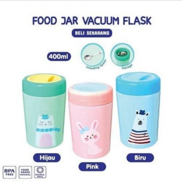 TERMOS MAKAN BABY SAFE FOOD JAR VACUUM FLASK 400 ML TER05(DILENGKAPI DENGAN SENDOK)Food Jar Vacuum Flask 400 ml adalah termos makanan untuk membantu menjaga suhu makanan di dalam termos tahan lebih lama. Memiliki lapisan dinding ganda, dimana terdapat ruang kosong yang kedap antara bagian luar dan bagian dalam stainless steel. Dengan demikian suhu di luar tidak cepat mempengaruhi suhu di dalam termos. Terbuat dari bahan 304 stainless steel food grade supaya lebih higienis, karena stainless steel adalah material yang tidak berpori, artinya kuman dan bakteri tidak dapat terserap ke permukaan. Dapat digunakan untuk membawa bubur, sup, mie, telur dan aneka makanan lainnya agar tetap hangat saat bepergian . Food Jar ini dilengkapi dengan sendok dan disimpan menyatu dengan food jar. Dengan desain karakter kartun lucu dan warna menarik yang pasti disukai si kecil.SpesifikasiUkuran : 400 mlWarna : Blue, Pink, GreenMaterialTermos : 304 Stainless Steel Food GradeBagian Plastik : Food Grade PolypropyleneSeal : Food Grade SiliconeKeistimewaan1. Food Grade Material• Bebas dari Bisphenol-A2. Dinding Vacuum Ganda• Dimana terdapat ruang kosong yang kedap antara bagian luar dan bagian dalam stainless steel. Dengan demikian suhu di luar tidak cepat mempengaruhi suhu di dalam botol.3. Dilengkapi dengan sendok#babysafe #thermos #termos #termosbubur #thermosbubur #foodjar #vacuumflask #babysafethermos #termosbabysafe #wadahmakananan #tempatmakan #tempatbubur #mpasi #asi #peralatanmakandanminumanbayi #perlengkapan