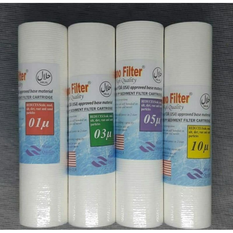 NOTE : Ready SEMUA UKURAN 1, 3, 5& 10 Micron. - Panjang Tube 10 Inch/InciCartridge Filter Sedimen untuk filter air / water filter housing dengan ukuran panjang 10 Inci Merk NanoBerfungsi untuk menyaring partikel - partikel sedimen padat yang ada dalam air, seperti pasir, lumpur, lumut, kerak, karat, dsb.Penggunaannya cukup dimasukkan ke dalam housing filter 10" dan diganti ketika filter sudah kotor / tekanan air berkurang (mampet).Usia pemakaiannya sangat tergantung dengan kualitas air, untuk air PAM biasanya 2-6 bulan, sedangkan air sumur sekitar 2minggu - 2 bulan.Ps. Mohon cantumkan ukuran micron yang diinginkan, jika tidak akan kami kirimkan secara random.NOTE : Ready SEMUA UKURAN 1, 3, 5 & 10M