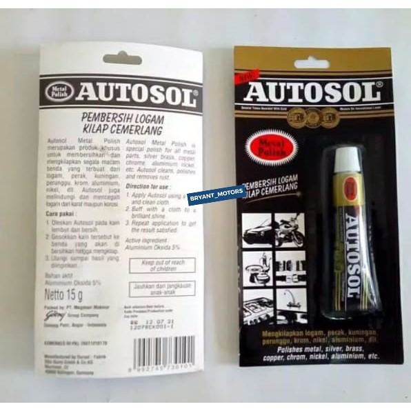 AUTOSOL METAL POLISH MERUPAKAN PRODUK KHUSUS UNTUK MEMBERSIHKAN,MENGKILAPKAN SEGALA MACAM BENDA YANG TERBUAT DARI PERAK,LOGAM,KUNINGAN,ALUMUNIUM,KROM,NIKEL,DLLAUTOSOL BISA JUGA MELINDUNGI DAN MENCEGAH LOGAM DARI KARAT DAN KOROSICARA PAKAI : 1. OLESKAN AUTOSOL PADA KAIN YANG BERSIH DAN LEMBUT2. GOSOKAN KAIN TERSEBUT KE BENDA YANG AKAN DI BERSIHKAN HINGGA MENGKILAP,ULANGI BEBERAPA KALI HINGGA HASIL YANG DIINGINKAN.KUALITAS TERJAMIN 100%JAM OPERASIONAL TOKO :SENIN SAMPAI SABTU SEMUA INVOICE PEMESANAN YANG MASUK SEBELUM JAM 5 SORE AKAN KAMI KIRIM DI HARI YANG SAMA,UNTUK DIATAS JAM 5 SORE AKAN DIKIRIM PADA KEESOKAN HARI #autosolmetalpolish #autosol #pembersih #pembersihlogam #pembersihbesi #perawatan #perawatanmotor #perawatanmobil #sparepartmotor #sparepartmobil #accesories